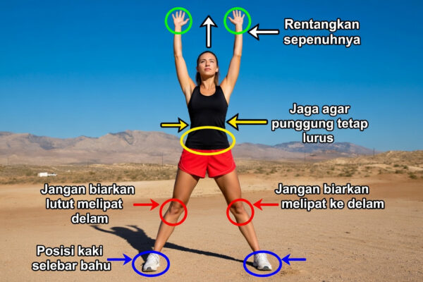 - Untuk menambah regangan pada punggung dan otot penstabil tulang belakang, angkat lengan kanan ke atas lalu condongkan tubuh ke kiri.