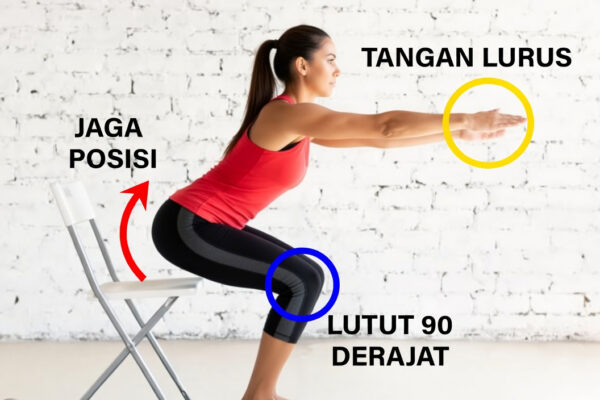 5. Turunkan tubuh secara perlahan hingga paha hampir sejajar dengan lantai.